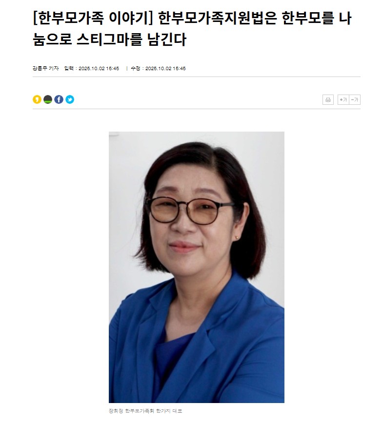 진정한 평등은 구분과 선별이 아닌, 보편적 인정과 존중에서 시작된다. 장애인은 이동권이 중요하고 다문화가족에게는 언어의 한계를 넘어서는 것이 중요하듯이 한부모가족에게는 혼자서도 아동을 안전하게 양육할 수 있고 재구성 가족이 되는 과정에 힘겹고 혼란스러운 심리적인 안정이 필요하다. 그러려면 소득을 통한 나눔으로 한부모가족을 지원하는 거이 아니라 한부모가족이 안정적으로 가족을 재구성하도록 모든 한부모가족을 통합하는 지원법이 필요하다. 낙인이 아닌 권리의 이름으로 모든 한부모가족을 다시 써야 할 때다.