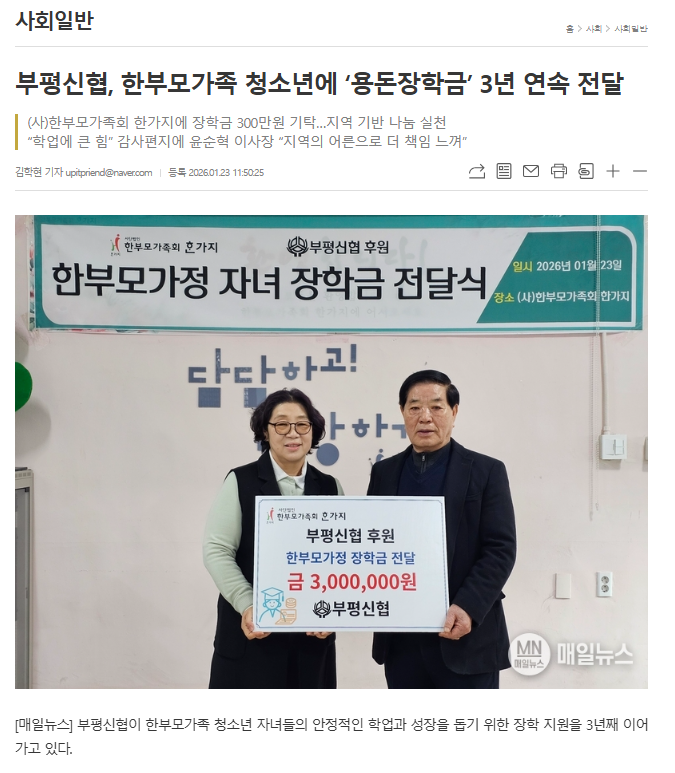 이번 기탁은 2023년부터 시작된 ‘한부모가족 청소년자녀 용돈장학금’ 지원의 일환으로, 부평신협은 3년 연속 장학금을 전달하며 지역사회 내 취약계층 청소년을 위한 지속적인 사회공헌 활동을 이어오고 있다.