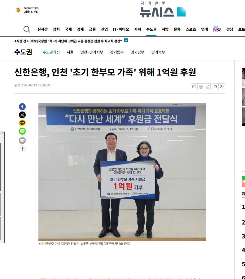 신한은행은 이번 후원으로 초기 한부모 가족이 겪는 복합적인 위기를 빠르게 해결하고 조기 자립을 이끌어낼 것으로 기대하고 있다.