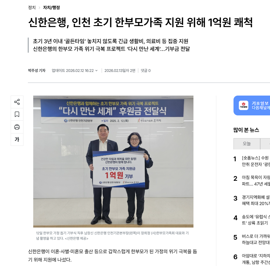 신한은행은 12일 인천지역 초기 한부모가족 지원을 위해 사단법인 ‘한부모가족회’에 후원금 1억원을 전달했다고 밝혔다.
