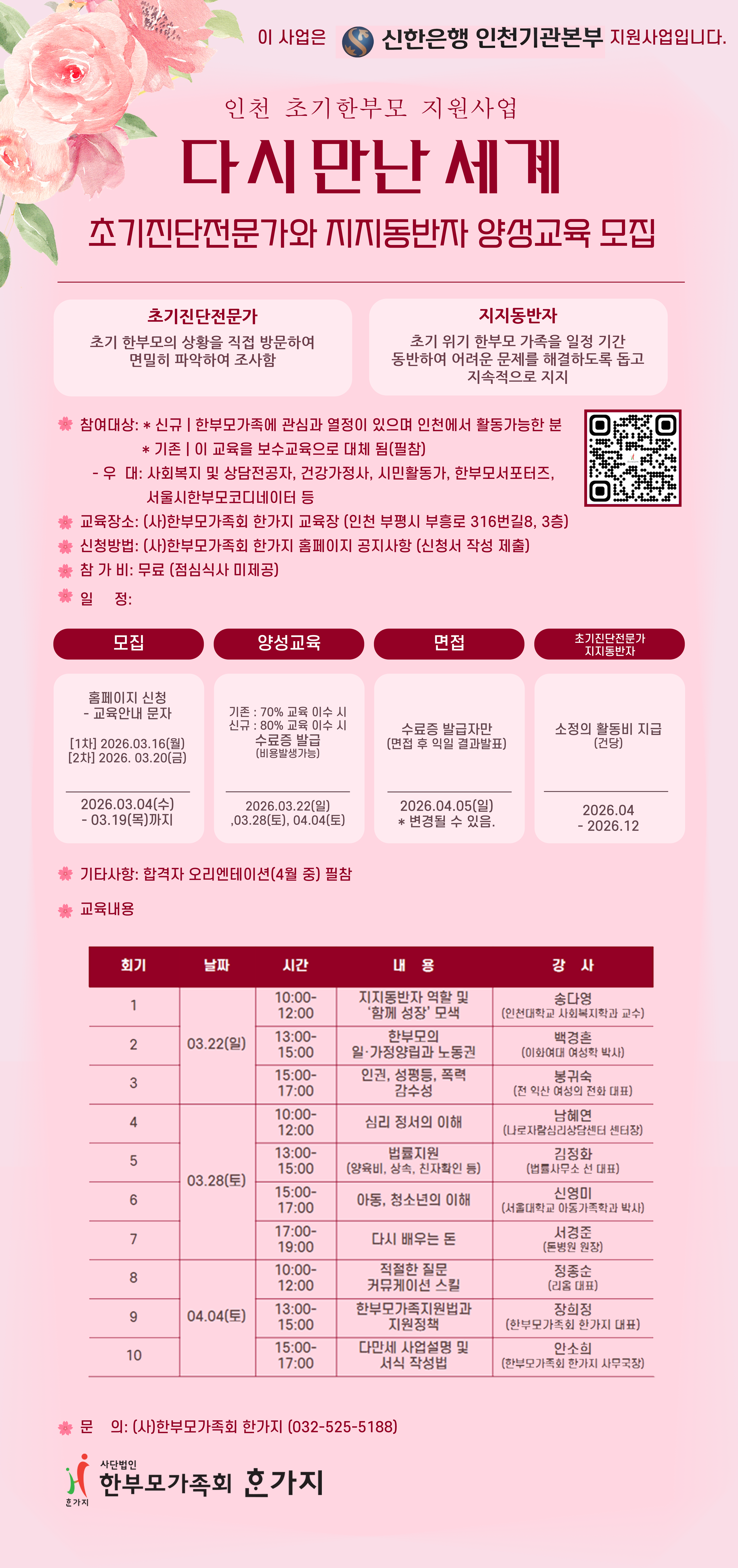 인천 초기한부모 지원사업 다시만난세계 [초기진단전문가와 지지동반자 양성교육 모집]