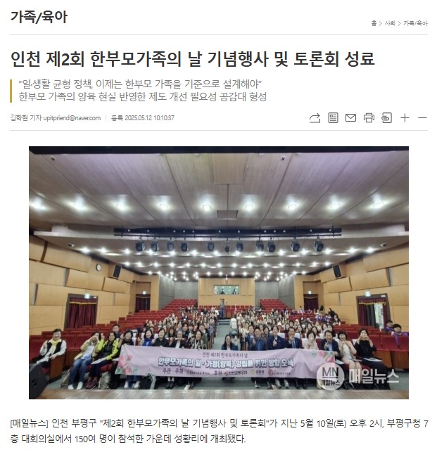 [매일뉴스] 인천 부평구 "제2회 한부모가족의 날 기념행사 및 토론회"가 지난 5월 10일(토) 오후 2시, 부평구청 7층 대회의실에서 150여 명이 참석한 가운데 성황리에 개최됐다.