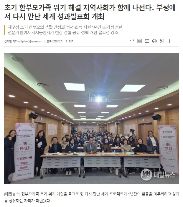 한부모가족회 한가지(대표 장희정)는 29일 오후 2시 부평구청 3층 중회의실에서 사회복지공동모금회 중앙회 지원사업인 한부모가족 초기 개입을 위한 위기극복 프로젝트 다시 만난 세계 성과발표회를 개최했다.