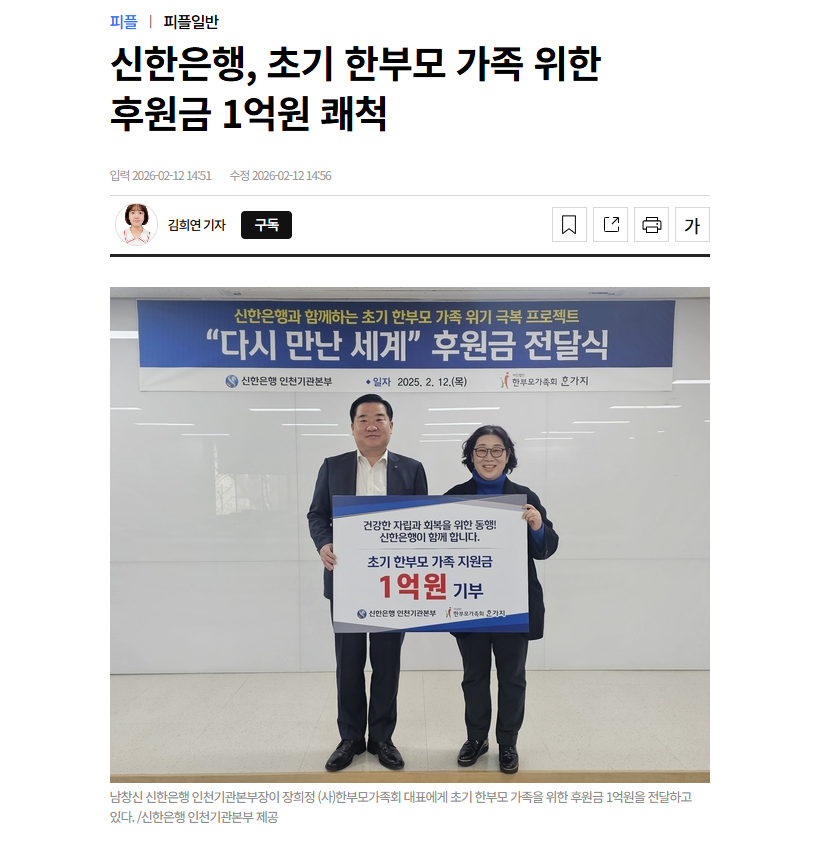 신한은행이 12일 (사)한부모가족회에 인천지역 ‘초기 한부모 가족’ 지원에 쓰일 후원금 1억원을 전달했다.