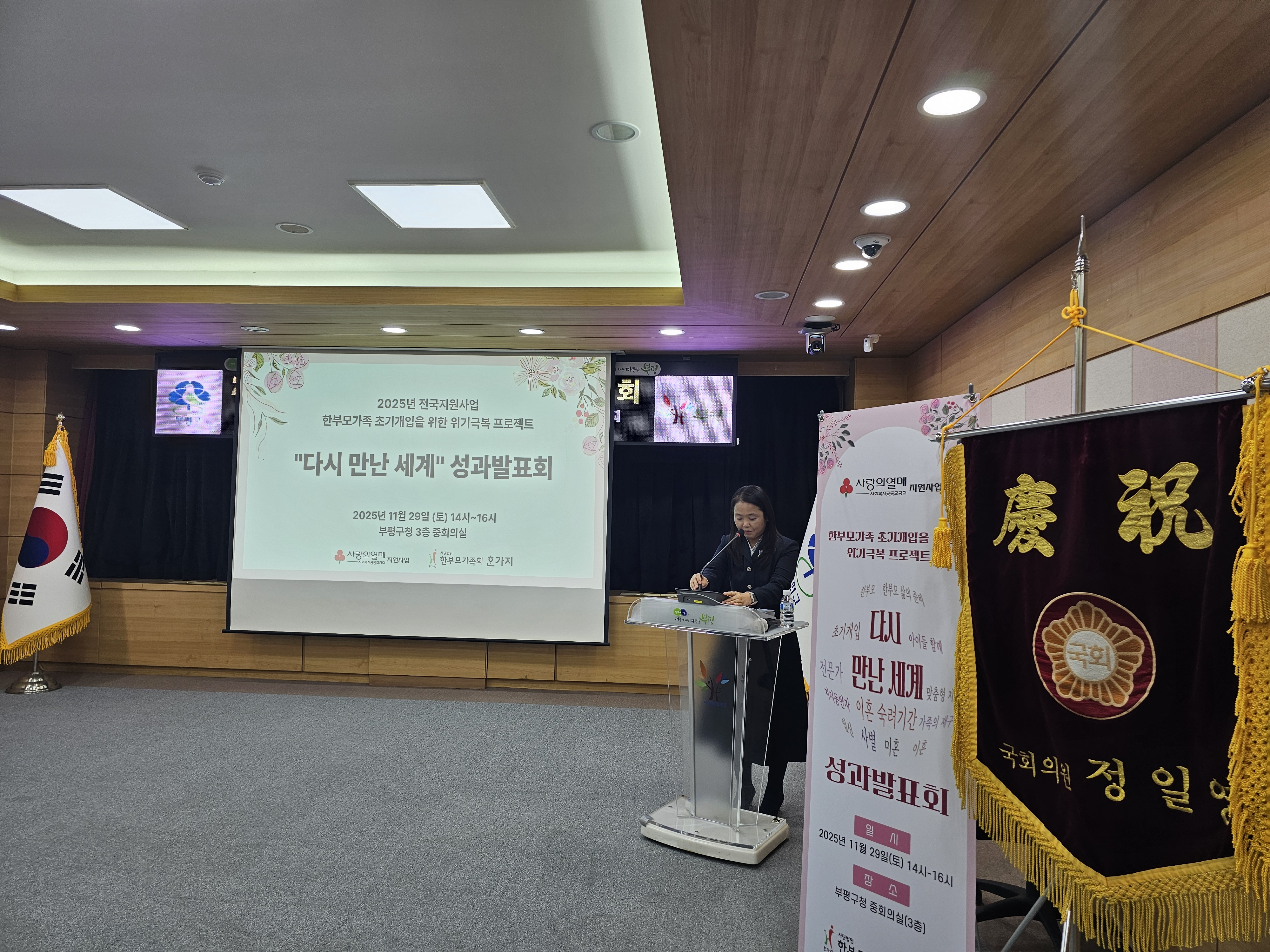 다시 만난 세계는 3년 이내 초기, 위기 한부모가족을 대상으로 진행한 사회복지공동모금회 전국사업입니다. 이 사업의 진행과정과 결과 등 이 사업의 효과와 필요성에 대한 내용과 참여해주신 참여자 분들과 지지동반자, 초기진단전문가님들의 사례발표가 주된 내용이었습니다.