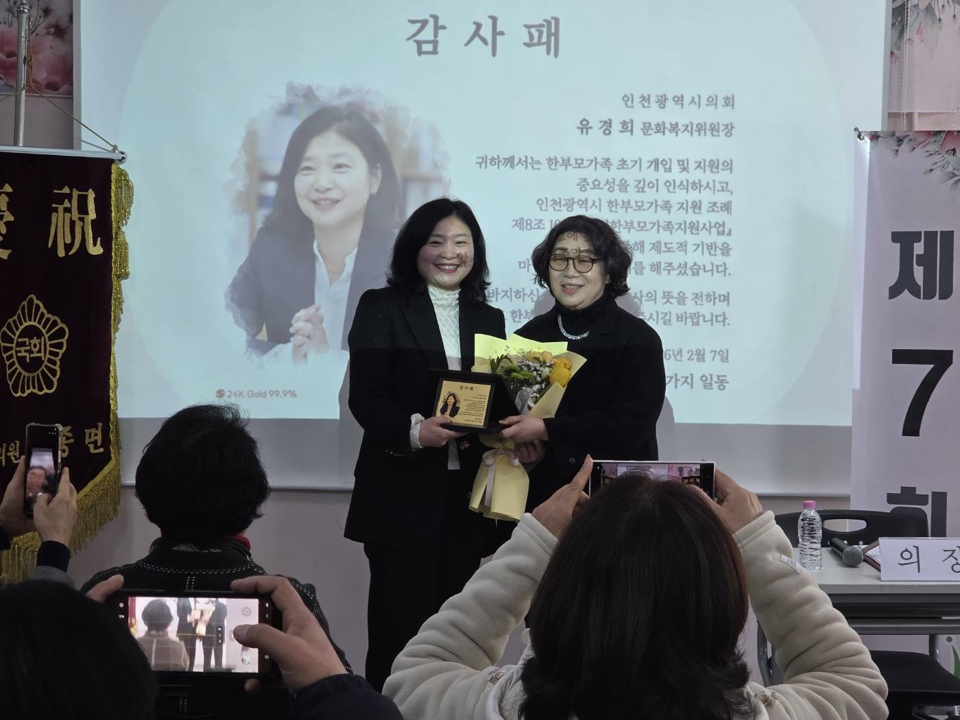 그리고 인천광역시 한부모가족 지원 조례 일부개정에 애써주신 인천광역시의회 문화복지위원회 위원장 유경희의원께 감사패를 전달하였습니다.