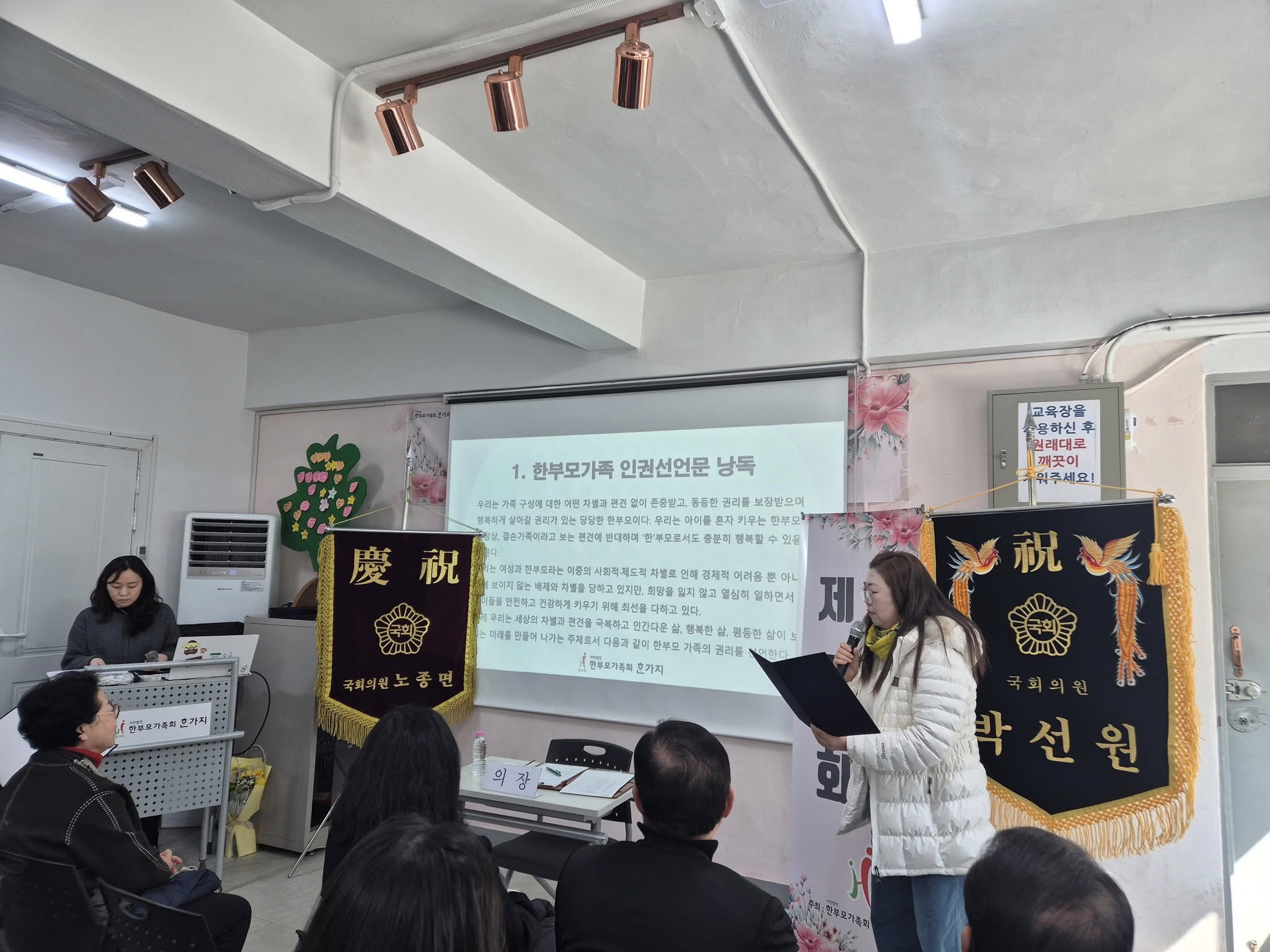 사회는 안소희 사무국장이 진행하였으며, 한부모가족 인권선언문 낭독은 포항에서 오신 송수연 정회원께서 낭독하셨으며, 이후 장희정 대표의 인사말씀이 있으셨습니다.